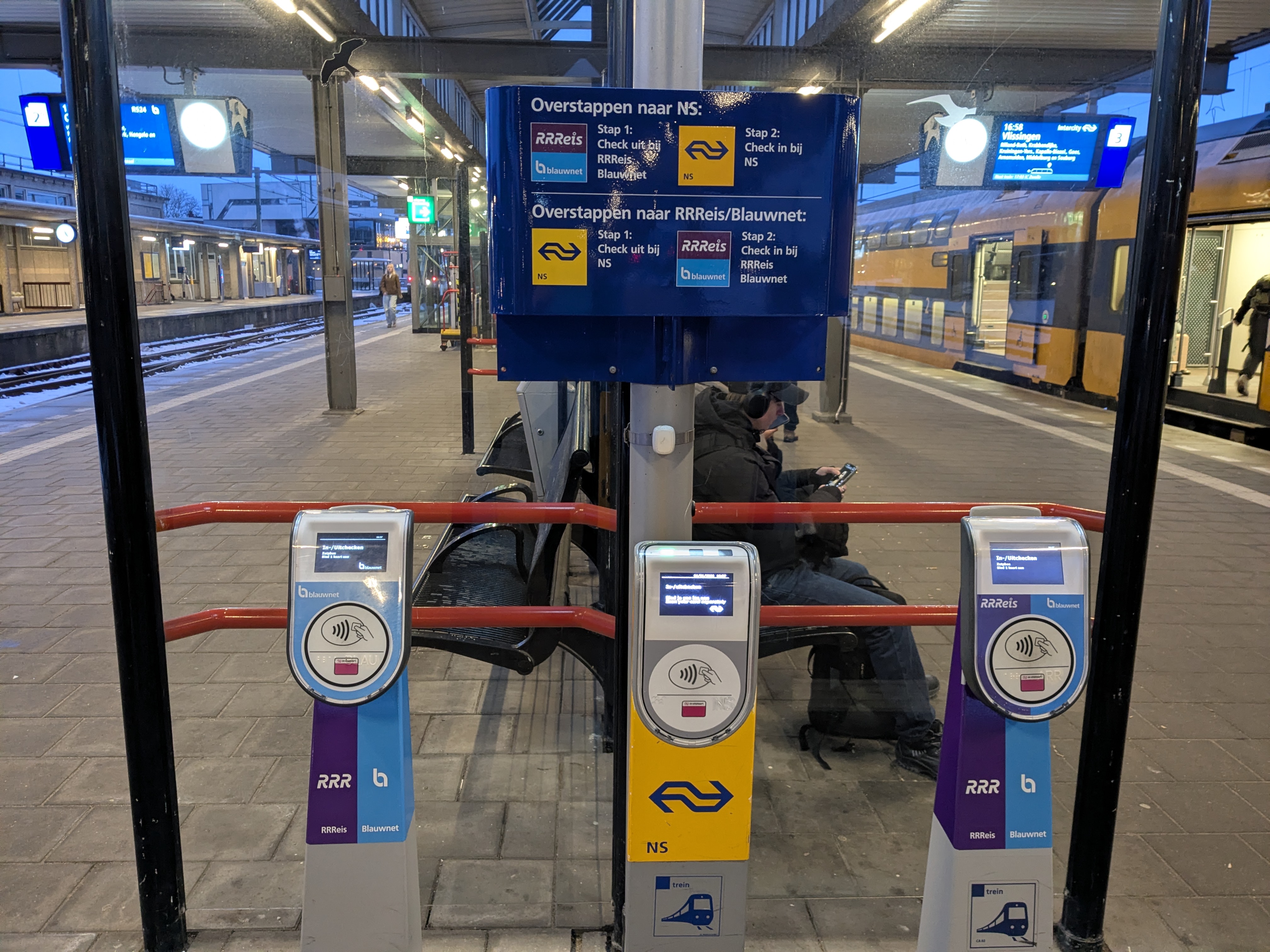 With contactless ticketing, you need to tag on and tag off (inchecken and uitchecken) at the card readers. Transferring between different companies / systems may require you to tap off one company and tag on with another comapny. (A Dutch journey planner tells you if you need to do so.) Most stations only have card readers of one company. As shown in the maps above, sometime you may encounter two. (Zutphen, which used to have three, now only has two: NS vs. non-NS.) Tap in and out of each company / system accordingly at the connecting station.